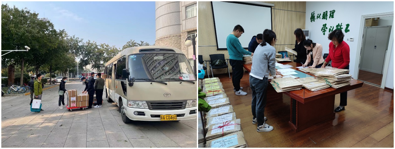 考务人员和安保人员押运试卷、进行试卷拆箱分拣工作